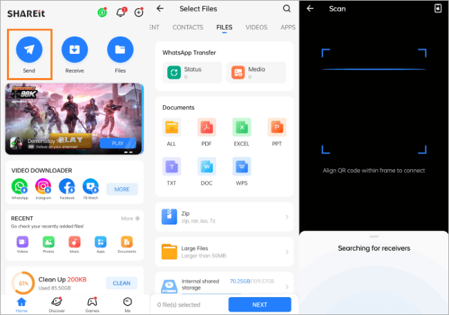 步骤4. 选择文件后,点击“下一步”继续。iPhone将开始搜索附近运行SHAREit的设备。