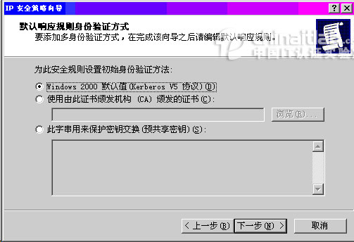 (5)接受默认的选项"Windows 2000 默认值Kerberos V5"作为默认响应规则身份验证方法,单击"下一步"继续。如图6所示。