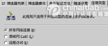 为每一个规则指定的连接类型可以决定计算机的连接(网卡或调制解调器)是否接受IPSec策略的影响。每一个规则拥有一种连接类型,此类型指定规则是否应用到LAN连接、远程访问连接或所有的网络连接上。如图23所示。